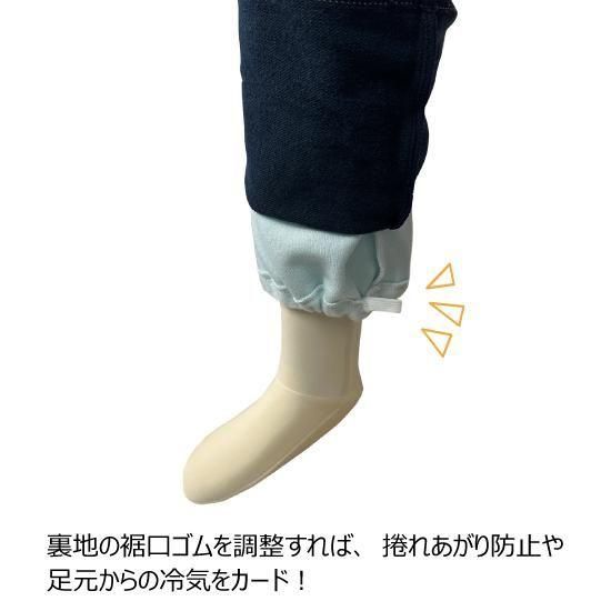 裏地の裾口には調整ゴムがあり、捲れ上がり防止&冷気をガード
